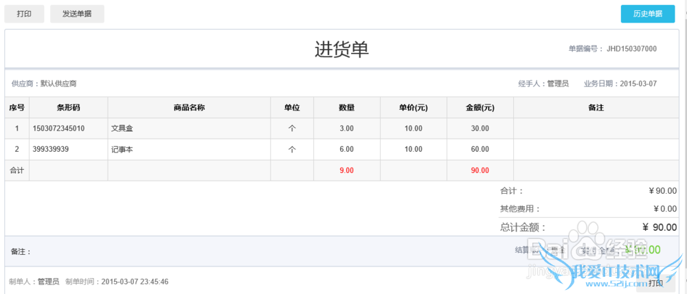 点击进货单上的【历史单据】按钮,返回至进货历史界面。
