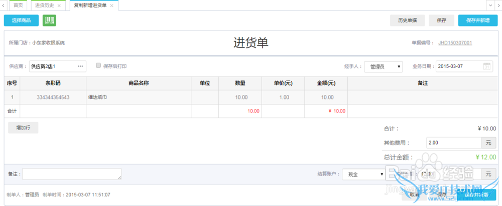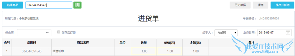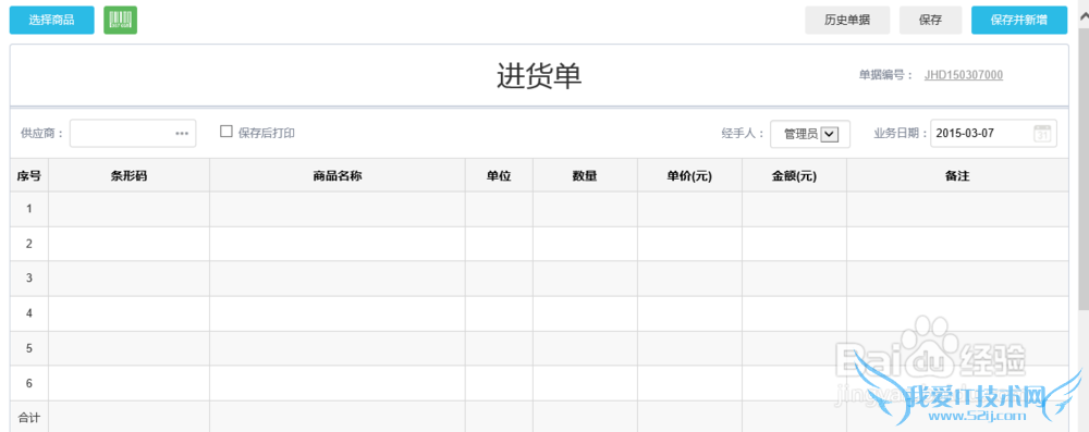 填写进货单:供应商、商品、实付付款为必填项,单据编号自动可自动生成,点击【保存】或【保存并新增】即一笔进货成功。