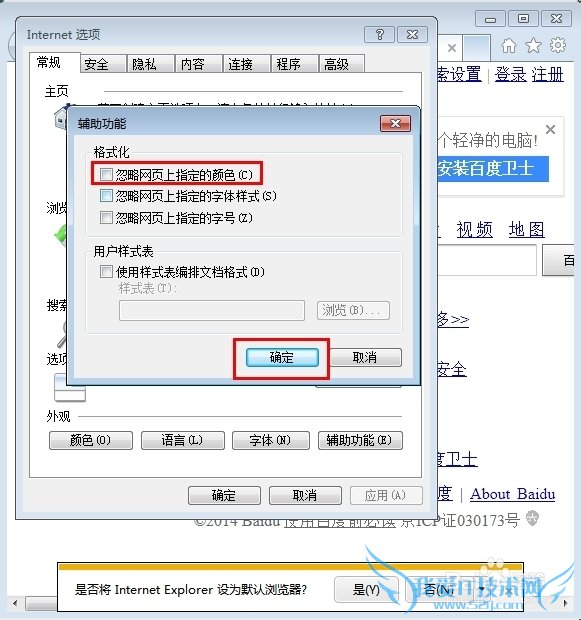 4.打钩“忽略网页上指定的颜色” 然后点击“确定” 如图