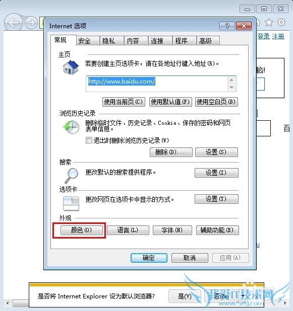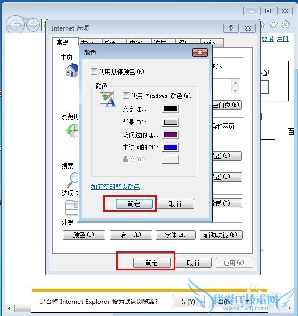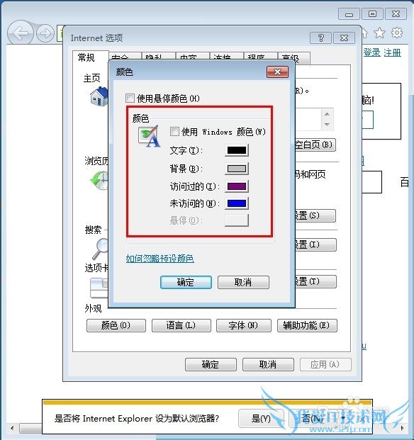 6.重新打开浏览器 ,然后进去Internet设置那里,打钩“颜色” 如图