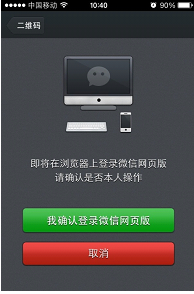 扫描结束后,在手机端会提示你是否确认登陆微信网页版,点击确认就可以了。
