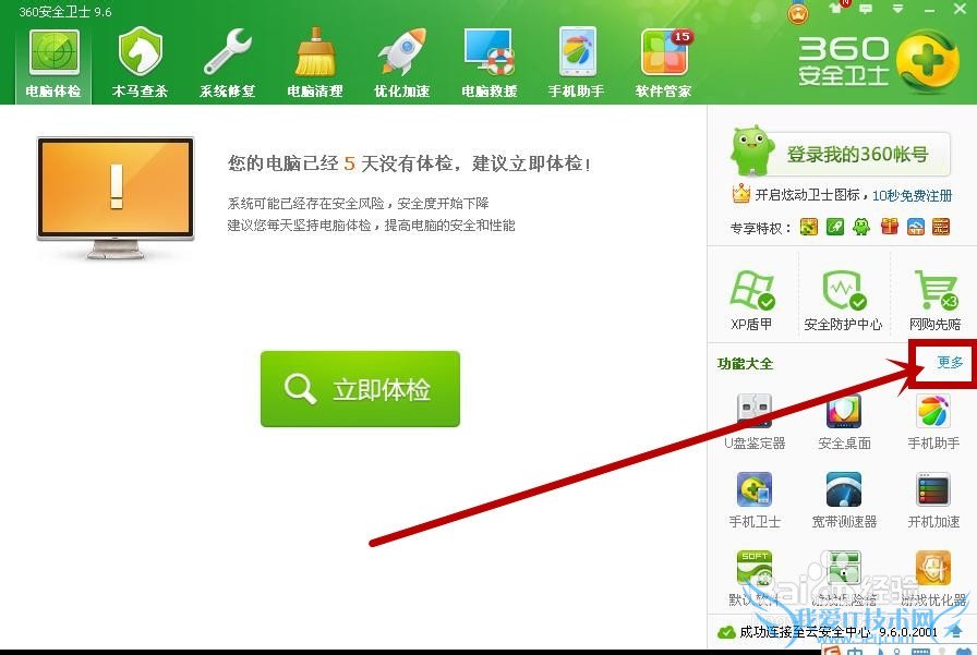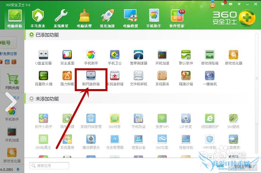 在360安全卫士窗口的右边,功能大全栏目,找到断网急救箱,如果找不到,请点击更多这个按钮: