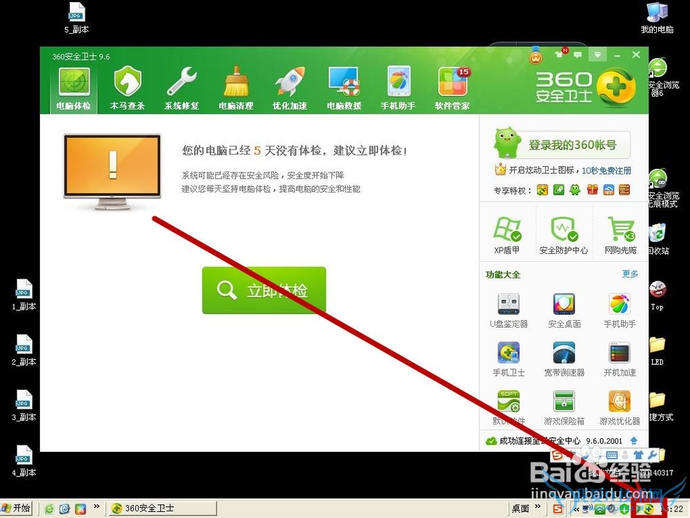 如果你使用360安全卫士,请点击右下角打开360安全卫士,位置如下图所示: