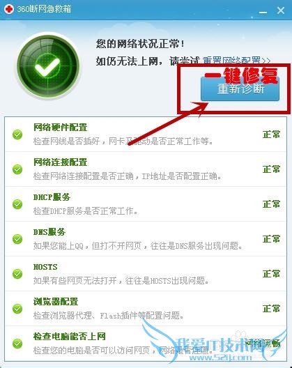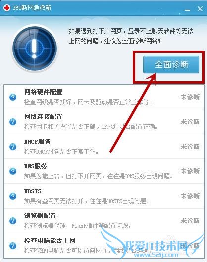 在弹出的360断网急救箱中,点击全面诊断按钮,如下图所示:
