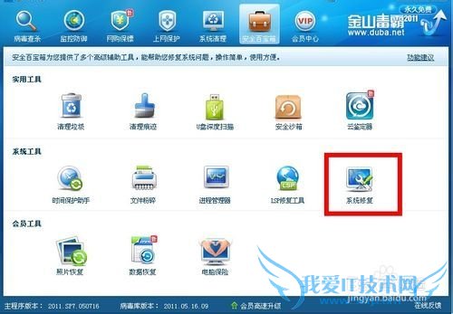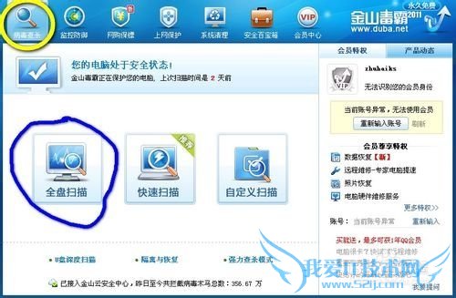 成功安装金山毒霸2011并升级到最新病毒库后,立即使用“病毒查杀”功能,绞杀绑架型木马病毒