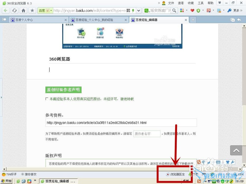 如果你使用360浏览器,请点击右下角打开浏览器医生,位置如下图所示: