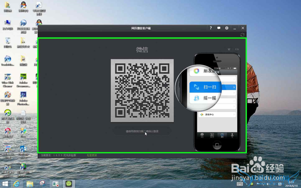 使用手机登陆你的微信,然后选择扫一扫中的功能进行扫描电脑桌面中的二维码【注意:扫描成功后手机会显示确认登陆选项,请在手机确定后方可在PC进行使用】