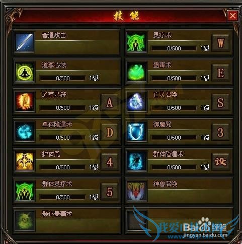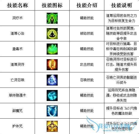 职业输出类型:远程道术攻击,恢复生命、施毒控兽,以强大的精神力,使用治愈之术来恢复生命,同时善用毒术以及操控亡灵、神兽,灵活多变的道术追击敌人!道士技能图及其介绍(如下图):
