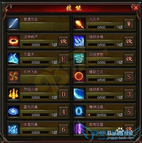 每一个技能都可以相应的级,每升一级伤害力与范围都会逐渐增加。您可以对技能进行快捷键设定(如下图),快捷键有1、2、3、4、5、6、Q、W、E、A、S、D,空的那个键就是清空之前的所有设置,技能设置可以按自己操作喜欢设置一下,也可以按技能冷却时间、或者单体输出全体输出、近攻和远攻等等方式设置一下。