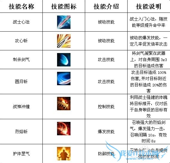 职业输出类型:近战物理攻击,高攻高物防,有着壮健有力的身体,专注于剑法和刀法的技巧,在战斗中蓄力待发,一击使敌人毙命!战士技能图及其介绍(如下图):