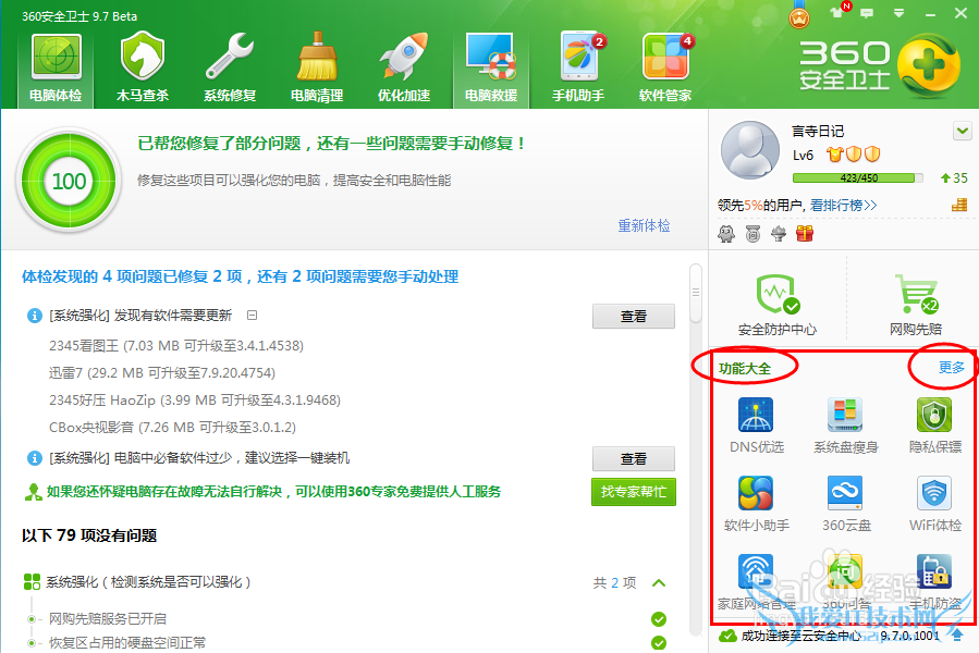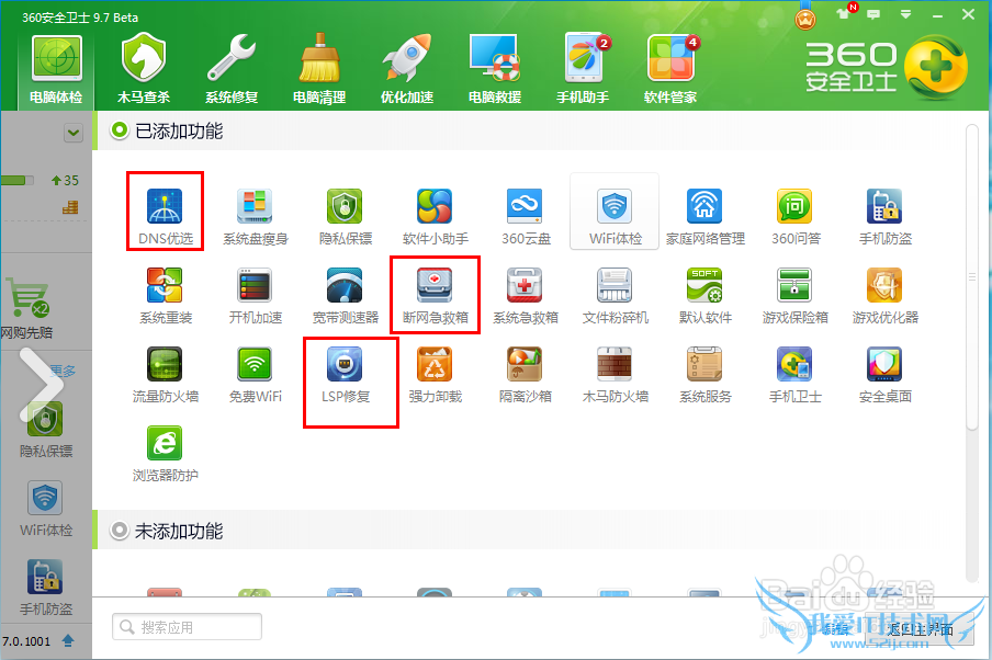 打开360安全卫士,选择在功能大全找到360断网急救箱/LSP修复/DNS优选;如果没有点击更多添加。