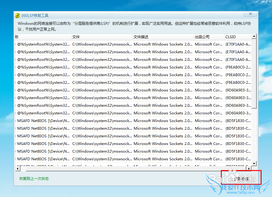 双击打开LSP修复,选择立即修复即可;若出现不能上网的情况,请点击恢复到上一次状态。