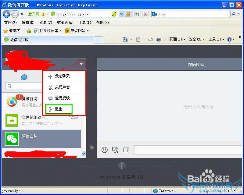 使用完网页版微信后你要记得退出网页版了,以免别有用心的人专了空子哦!怎么退出呢?请看下图: