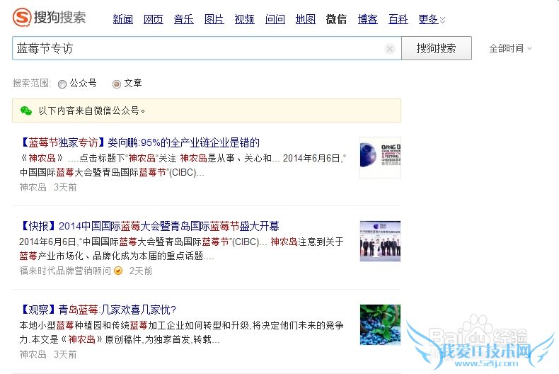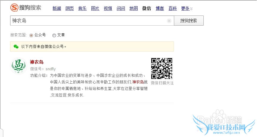 如输入“神农岛”后,即可出现神农岛公众号信息。同理,若想搜索相关文章,将搜索范围改为“文章”,直接输入即可。