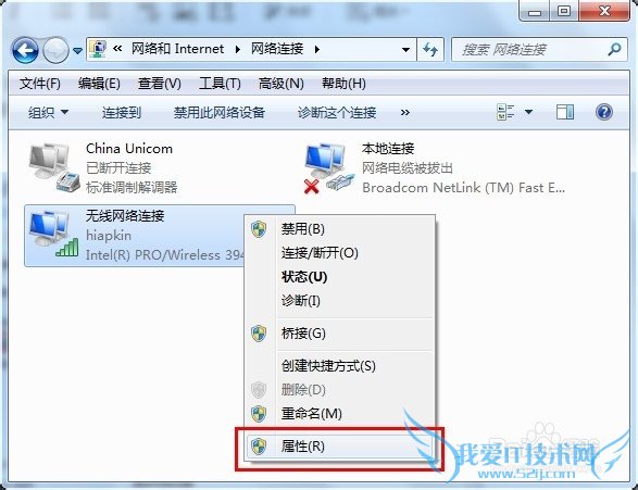 第二步:在网络适配器设置界面,会列出当前电脑所有的网络连接方式,找到当前已经连接上网络的网络适配器,并对着它点击鼠标右键,选择属性,进入网络适配器属性窗口