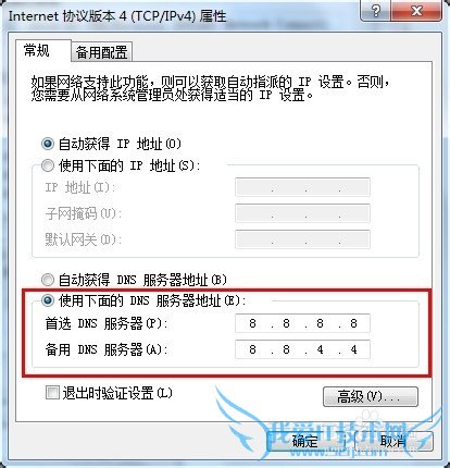 第四步:在TCP/IPV4属性界面,先点击“使用下面的DNS服务器地址”,分别在首先DNS服务器和备用DNS服务器中输入8.8.8.8和8.8.4.4,再点击确定保存设置
