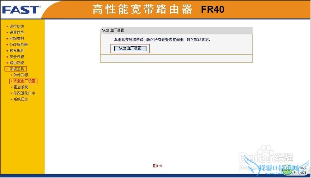 3、路由器设置不当或者温度过高导致只能上QQ,不能打开IE浏览器,这种情况多半发生在路由器使用了几年,由于路由器常年处于发热的工作状态,会导致路由器里面的器件和空气中的氧气发生化学反应,导致芯片接触不良,那么,路由器就只能发挥中转小数据包的功能,这样也会导致只能上QQ,不能打开IE,这个时候的处理方法是,更换路由器,或者使路由器通风良好。如果是路由器设置不当导致只能上QQ,不能打开IE浏览器,那么我们可以对路由器进行设置,最好的办法是,让路由器恢复默认值,然后在去设置路由器共享上网。(注意:路由器恢复出厂默认值,会将你以前设置的拨号账号和密码清除掉,如果你记得拨号的账号和密码,那么,你可以做恢复默认值设置,然后在设置路由,如果你不知道账号密码,那么,你可以打电话你申请宽带的地方,他们要核实了你的身份证和姓名以后,会提供你的账号和密码的,提供账号和密码给你以后,你在恢复路由器的默认值,然后在设置路由器。)有两种方法,方法一、如图1-9: