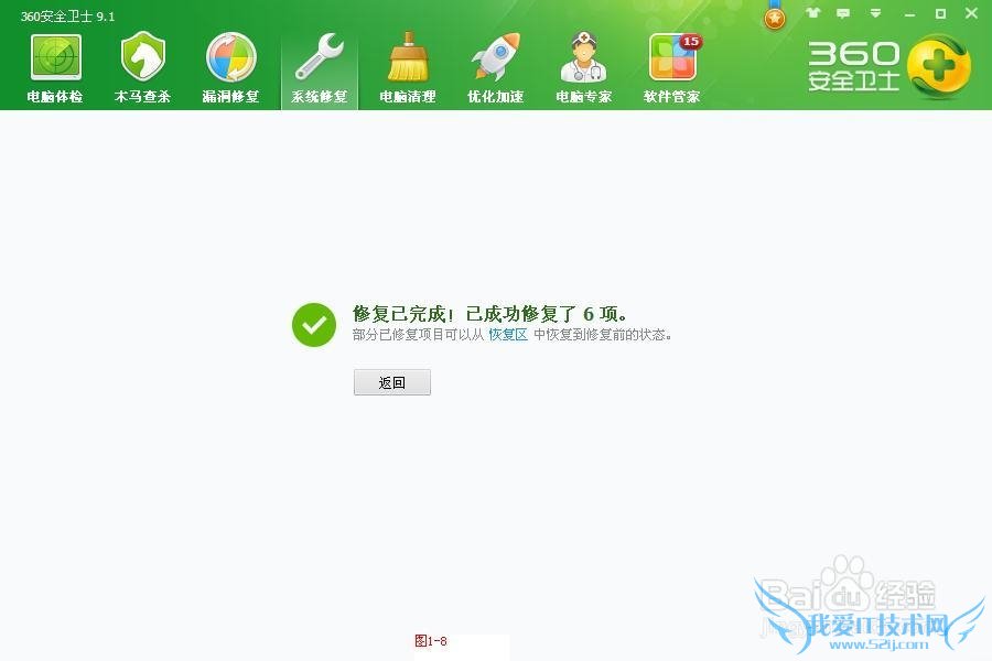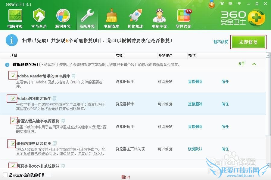 勾选要修复的项目,一般都可以修复的,然后点击“立即修复”,出现图1-8: