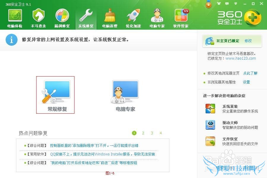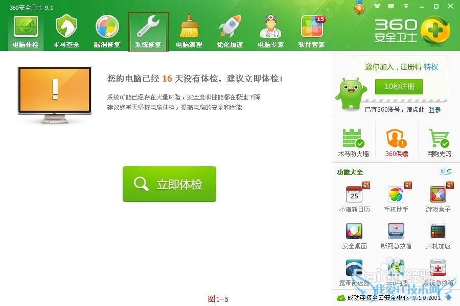 2、IE中毒或者加载了很多插件,导致IE无法打开网页,这种现象,我们需要用“金山卫士”或者是“360安全卫士”来修复系统,现在用360安全卫士为列,打开360安全卫士,如图1-5: