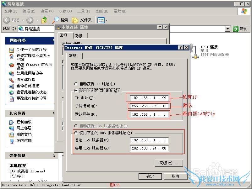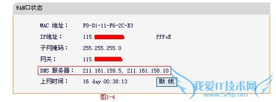 使用下面的IP地址,IP地址一般设置为和路由器LAN同一个网络段的,子网掩码一般默认即可,网关设置路由器LAN的IP地址,(注:是通过路由器中转到Internet的所以网关要设置路由器的LAN接口的IP,就是告诉这台电脑,是通过192.168.1.1这个地址代理出去访问Intelnet的。)DSN服务器的设置,首选DNS和备用DNS,这个一般是ISP提供的,如果你不知道自己的DNS是多少,可以通过打电话给你接宽带的人,问他DNS是多少,或者是打电话给宽带提供商问是多少,也可以通过查看路由器得到DNS是多少,如图1-4: