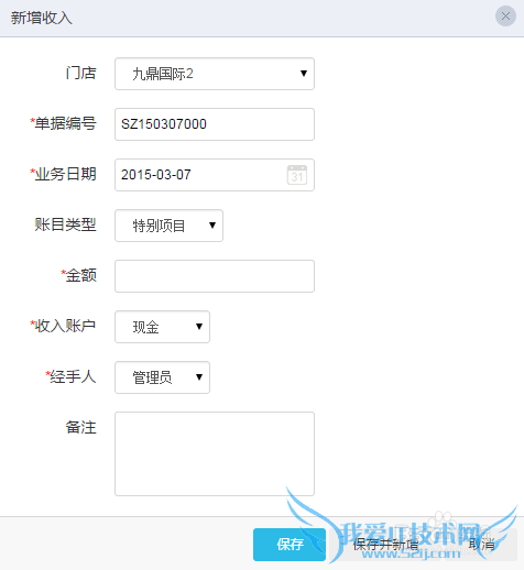 选择账目类型,金额,收入账户,经手人等必填项目,点击【保存】或【保存并新增】,新增一笔收入成功。