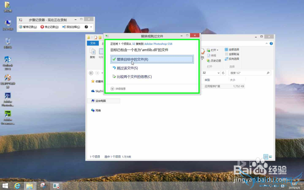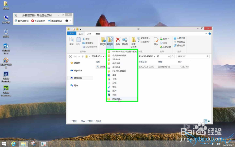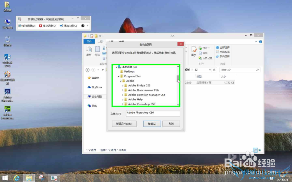 步骤 9: 用户在"Adobe Photoshop CS6 (树项目)"上左键单击(在"复制项目"中)选择你要将“amtlib.dll”复制到的地方,然后单击“复制”按钮