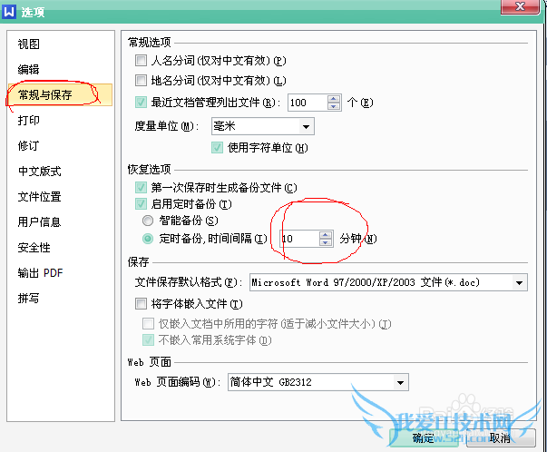 在上面打开的选项窗口选择左边的常规与保存,在该选项卡下面找到恢复选项,在定时备份时间间隔设置为1分钟,设置好后点击确定退出,这样就可以每分钟自动帮我们备份文档,即使出现没有保存之类的也能找回文档的90%以上内容是吧。