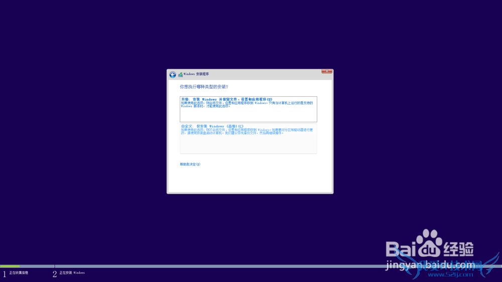 ↓ 选择升级或自定义(升级后就没有截图了,按照向导来吧。升级出来的系统为单系统,只有 Windows 8.1,但是你现在所使用的系统的数据还在,升级仅支持 Windows Vista,Windows 7,Windows 8)