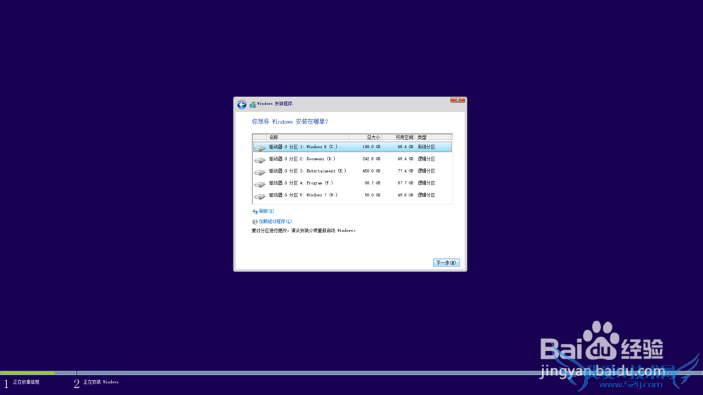 ↓如果你选择了自定义,在这里选择分区安装就可以了,千万不要选择你现在所运行系统的系统盘,选择一个其他盘后,会格式化该盘,然后重启数次,就会安装为多系统(Windows 8.1 和你现在的系统),新安装的 Windows 8.1 不会有你现在的数据,所以要做好备份工作。