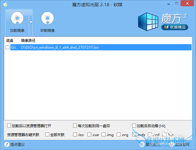 下载后为 ISO 文件,同样也需要虚拟光驱,但是在 Windows 8.1 中,双击 ISO 文件就会自动加载了,不需要魔方虚拟光驱了。只有 Windows 8 和 Windows 8.1 才有这个功能!
