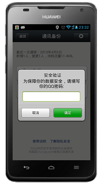 这个过程中,将提示你输入QQ密码。注:QQ和微信是不同的产品,通讯录备份的数据最后是存放在QQ通讯录里。注:QQ通讯录是QQ的一个功能,虽然大部分人都没有用过这个功能,同步的过程是时间长短,根据你通讯录里记录数多少有关。如下图所示:
