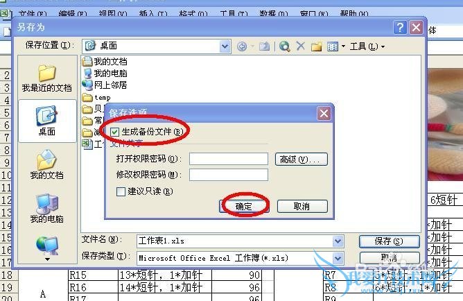 在Excel表格中点击“文件”菜单,选择“另存为”,在打开的“另存为”对话框中,按右上角的“工具”命令,点击“常规选项”,出现“保存选项”对话框后,在“生成备份文件”选项前面打勾,然后按确定就可以了。