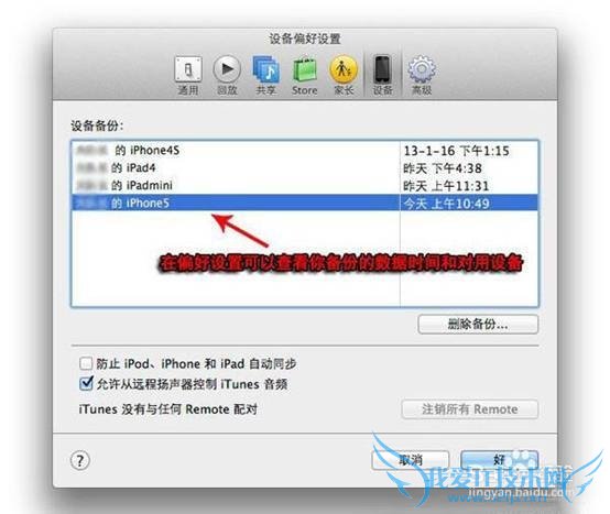 步骤三:备份完的文件大家可以在iTunes的偏好设置-设备中查看,这里会显示你备份的设备及备份的时间。