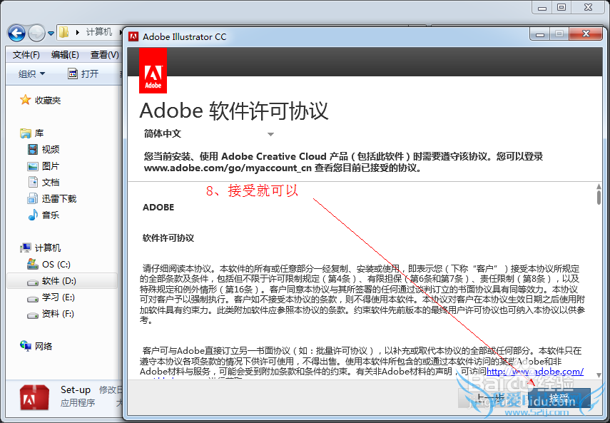8.接受Adobe软件许可协议,就可以进行下一步操作