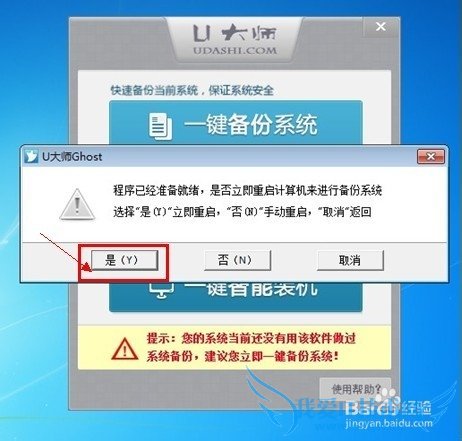 2.点击“一键备份”,会弹出确认框点击”是”确认,如图:
