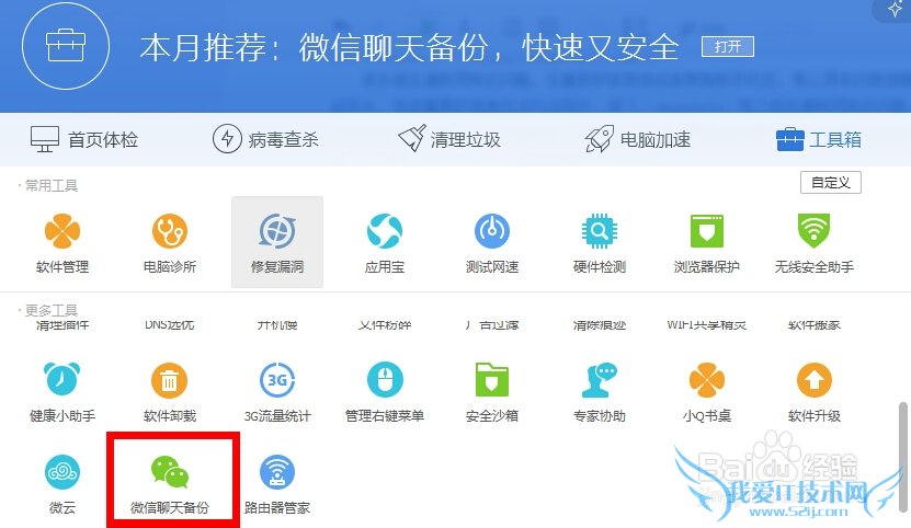第一步、先打开电脑管家,点击工具箱,点击微信聊天备份,系统会自动安装该功能。