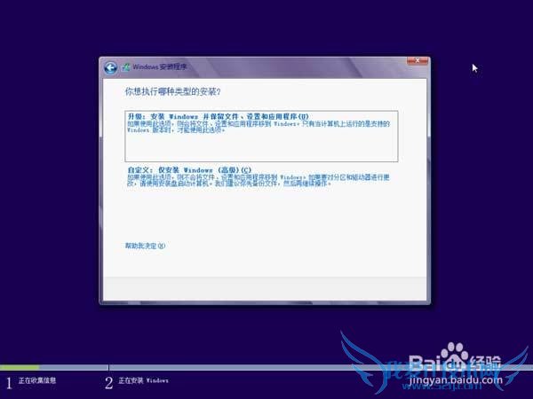 选择哪种类型的安装。这里推荐“自定义安装”。升级安装总会出现一些不如意的地方: