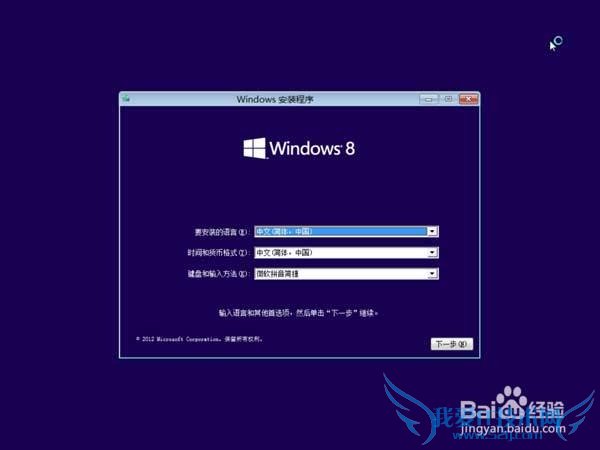 稍等准备就会出现Win8安装界面了。和Win7类似,不多说,点击下一步即可!