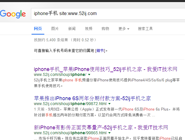 如果使用者只想在某个特定网站搜索资料,例如:想在我爱IT技术网网站上寻找有关癌症预防的讯息,只要在谷歌搜索栏内键入【iphone手机 site:www.52ij.com】即可。
