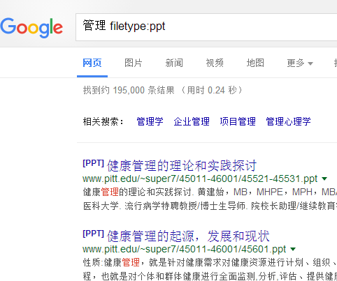 学生常常要写报告,有时候想找一些特定文件作为参考资料,譬如:需要用 PPT格式的文件,那么只要在谷歌关键字前面或是后面输入 filetype:ppt 就行了。例如:【企业管理 filetype:ppt】。酷吧!作为学生一定要学会。(网站截图)