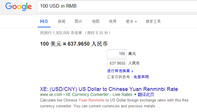 汇率或是单位换算对谷歌而言十分容易,只要输入【金额 外币简称 in 外币简称】就可以了,例如想查100美金能兑换多少人民币?只要直接打【100 USD in RMB】即可。至于单位换算也是同样的操作方法:像【10 inches in cm】就是想知道10英吋等于几厘米。