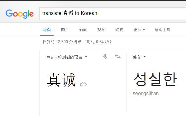 在谷歌搜索将中文“真诚”翻译成韩文的写法。(网站截图)