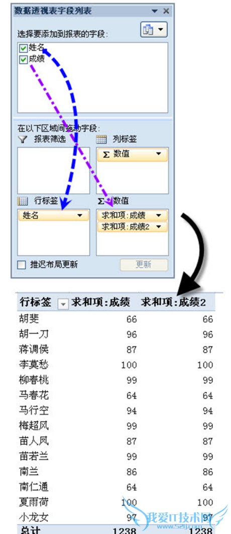 3. 在“数据透视表字段列表”中,拖动“姓名”字段到“行标签”区域,两次拖动“成绩”字段到“Σ 数值”区域。关闭“数据透视表字段列表”。