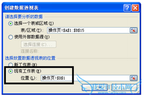 2. 弹出“创建数据透视表”对话框,“选择放置数据透视表的位置”,本例选择D1,单击确定,插入一个数据透视表。