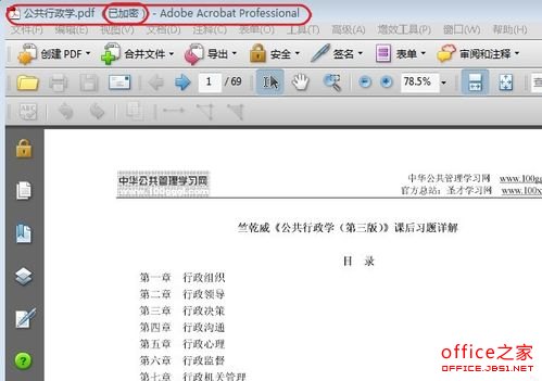 重要:如何判断是否加密:用adobe reader或者adobe acrobat软件打开你的PDF文件,如果提示输入密码的话,那么这个文件不用多说肯定是加密的。如果打开没有要求输入密码,打开后看软件标题栏处,PDF文件名称后面如果有“(已加密)”三个字样的(见下图示例),那么这个文件还是加密文件,这种文件也是不能够直接转换的,需要去掉权限以后才能够转换,相见本文最下面注意事项。