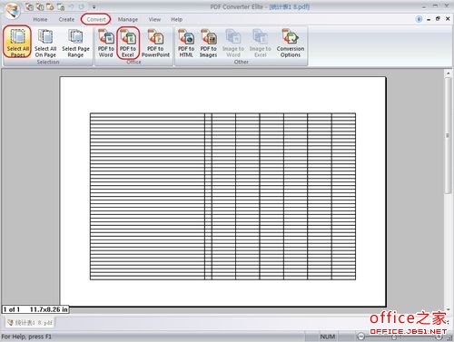 从右上角黄色文件夹出打开你的PDF文件,然后在菜单edit下选择select all pages 然后点excel那个图标的按钮,弹出转换对话框,默认在Automatic选项上就可以,然后点convert按键,等待转换完成就可以。