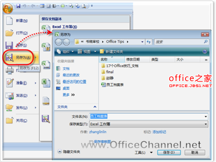 (1)打开目标工作簿,单击【Office按钮】,在随即打开的下拉列表中执行【另存为】命令,打开“另存为”对话框,或者按【F12】键同样可以打开该对话框,如图1所示。