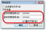 (3)此时,将打开“常规选项”对话框,在“文件共享”区域内设置不同的“打开权限密码”和“修改权限密码”,并选中“建议只读”复选框,如图3所示。