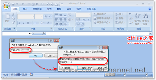(6)当再次打开该工作簿时,Excel将同时打开提示对话框,用户需要输入打开权限密码方可查看工作簿,密码输入完成以后单击【OK】按钮。随后还将打开写权限提示对话框,输入修改权限密码后单击【确定】按钮即可打开并修改工作簿。如果无需修改文档则可以只读方式打开工作簿,此时不必输入密码直接单击【只读】按钮即可,如图6所示。