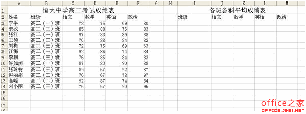 选中表格,点击菜单栏(以excel2003为例,其他类似)“数据”——>“分类汇总”,“分类字段”选“班级”,汇总方式选平均值,选定汇总项勾上语文(后面再一一选其他的科目),点击“确定”。